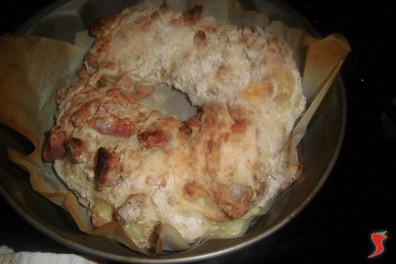 Lievitato l'impasto, disponetelo su un piano da lavoro e aiutandovi con la farina formate un salsicciotto e disponetelo nello stampo formando un ciambellone. Infornate a 200°C per circa 40 minuti.