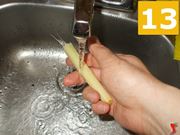Lavate la costa di sedano (13) sotto l'acqua fredda, e poi tagliatela a listelle sul tagliere, per tritarla grossolanamente (14) e metterla nella ciotolina (15) a parte.