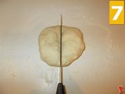Una volta ottenuto l'impasto mettetelo su un piano di lavoro di legno che avrete debitamente infarinato, quindi tagliatelo in due (7) parti che dovrete stendere con il matterello (8) separatamente per avere due sfoglie di un millimetro (9) di spessore circa. Lasciatelo riposare il tempo che preparate gli altri ingredienti.