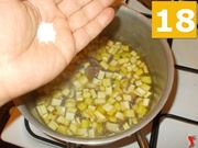 Ora aggiungete alla minestra anche la crosta di parmigiano (16) spezzata in pezzi, un pizzico di cumino (17) e salate (18) a vostro piacere senza esagerare. Coprite con il coperchio e lasciate cuocere per circa un'ora.
