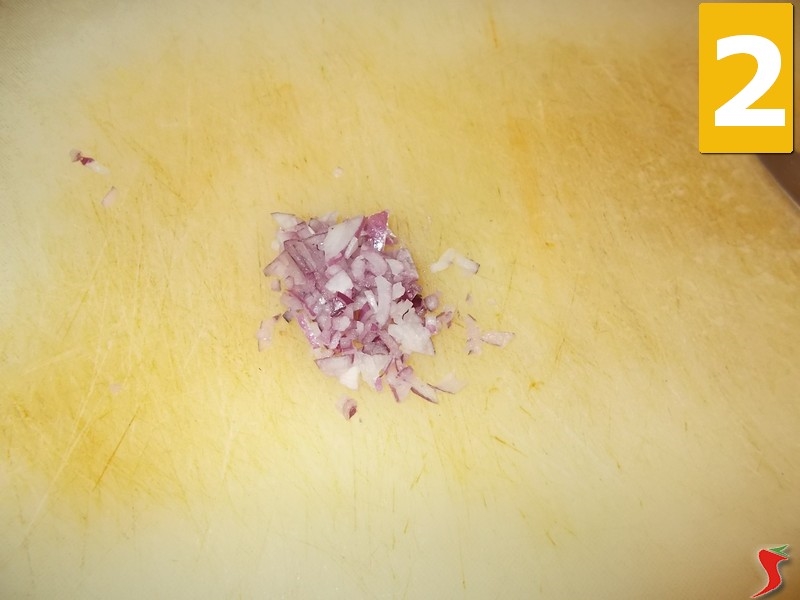 Cominciate con il versare sei cucchiai di olio extravergine di oliva (1) in un tegame ampio, per poi porci il peperoncino. Quindi tritate finemente la cipolla (2) e mettetela nell'olio (3) che avete versato nel tegame.