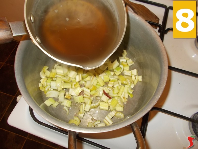 Ora accendete il fuoco sotto il tegame mantenendo una fiamma media e fate soffriggere la cipolla per due minuti. Quindi aggiungete il sedano (7) per farlo soffriggere per qualche minuto in modo che si aromatizzi nell'olio piccante. Poi aggiungete il brodo caldo (8) e lasciate sobbollire (9) per qualche minuto.