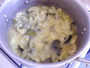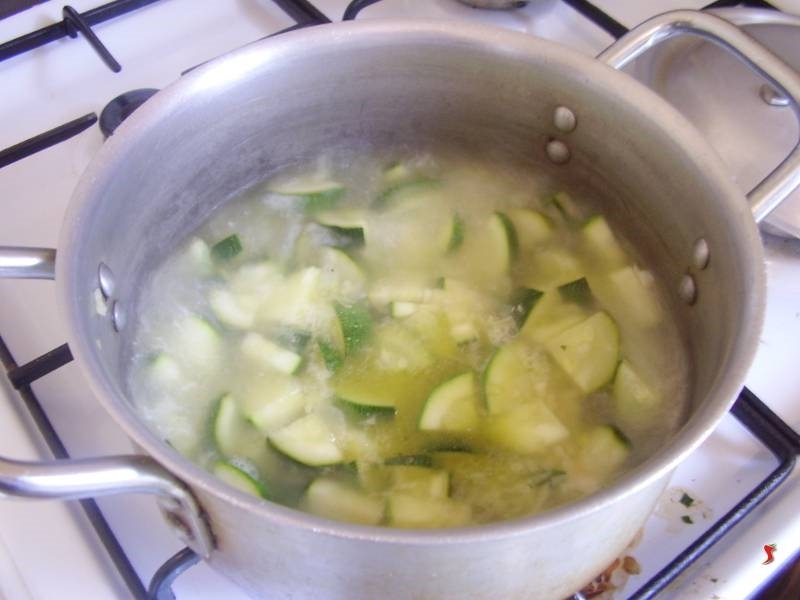 Fate sfumare un pochino il vino senza lasciarlo consumare tutto e quindi mettete i cubetti di zucchine a cuocere, mescolando bene per far insaporire per circa cinque minuti. Una volta insaporito mettete il brodo ben caldo fino a coprire tutte le zucchine e lasciate andare per circa 30 minuti a fuoco moderato con il coperchio per non far consumare il brodo.