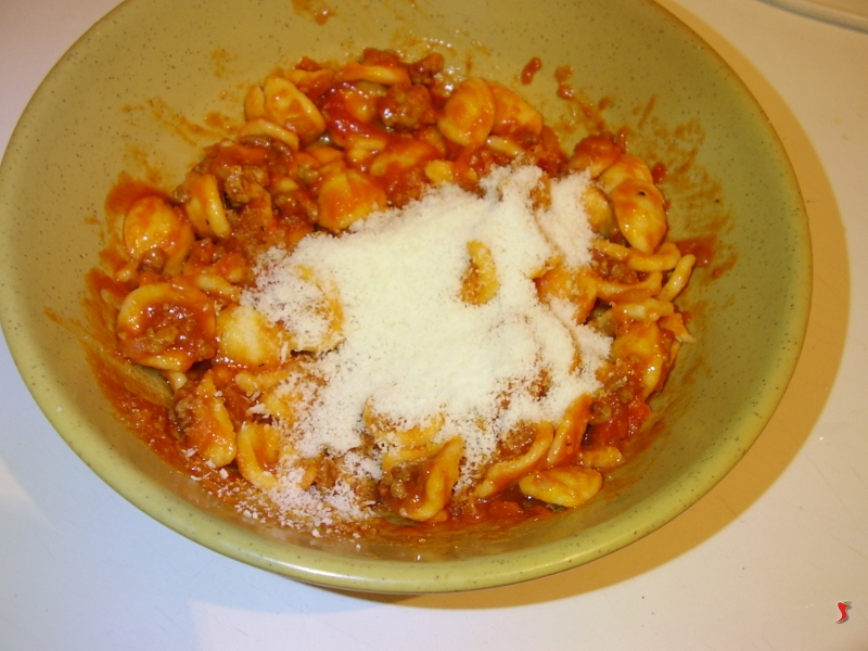 Quindi mettete l'acqua a bollire l'acqua e cuocete le orecchiette. Quando pronte mettetele in una insalatiera e metteteci sopra il ragł e poi il parmigiano. Quindi servite in tavola ben caldo.