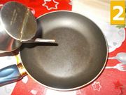 Per prima cosa mettete abbondante acqua salata a bollire per la pasta, in modo che sia pronta il prima possibile. Poi iniziate la ricetta sbucciando l'aglio (1) e versando cinque cucchiai di olio extravergine di oliva (2) in una padella ampia ed antiaderente. Fate scaldare l'olio, e poi aggiungete anche l'aglio (3) per farlo dorare. Una volta pronto, spegnete il fuoco.