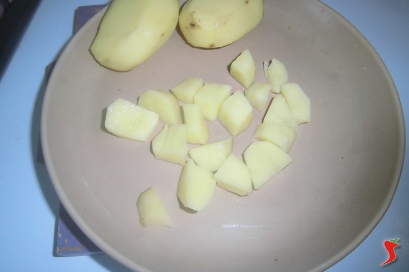 Mentre il vino bianco sfuma, pelate le patate, tagliatele in tanti piccoli cubetti e poi aggiungetele ai funghi.