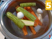 Iniziare questa ricetta partendo dalle verdure, le quali dovranno essere lavate e poi tagliate (4). In seguito, prendere una pentola capiente, riempirla di acqua e aggiungere al suo interno le verdure (5). Riporre tutto sul fuoco a fiamma vivace così da consentirne la cottura e la realizzazione del brodo (6). Salare quanto basta.