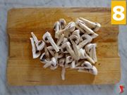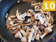 Successivamente, si può continuare la preparazione procedendo con i funghi (7), i quali dovranno essere lavati accuratamente e poi, dopo averli riposti su di un tagliere, dovranno essere tagliati in più parti (8). Poi, prendere una padella capiente e riporre i funghi al suo interno, posizionare il tutto sul fuoco a fiamma vivace così da permettere che l’acqua si asciughi (9).