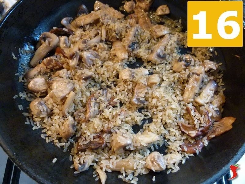 Dopo aver aggiunto il riso nella padella con i funghi, lasciarlo tostare per almeno qualche minuto, mescolando il tutto così da distribuire omogeneamente tutto il condimento (13). In seguito, aggiungere man mano mestoli di brodo (14), così da consentire la cottura del riso (15).
