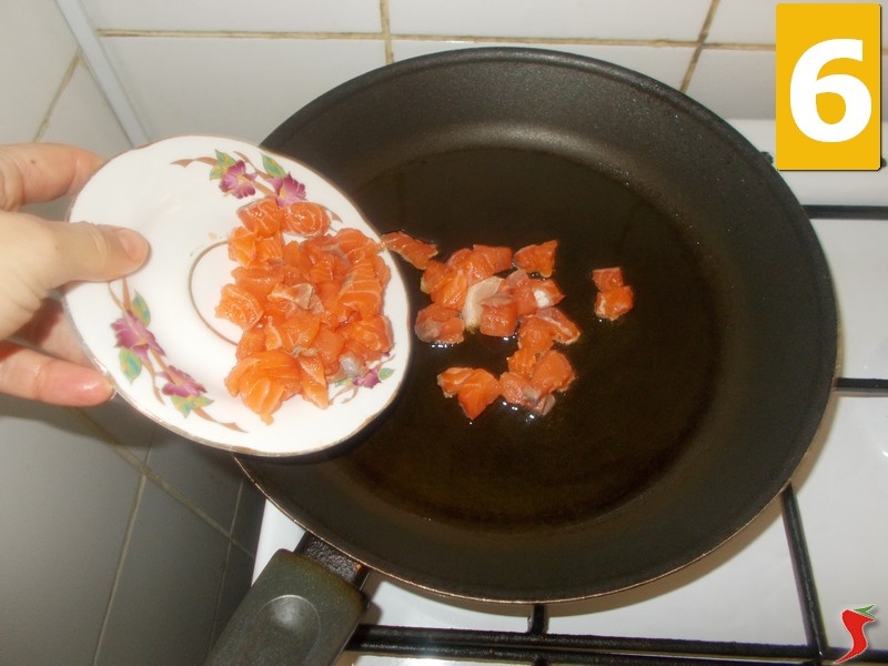 Ora aggiungete tre cucchiai di olio di oliva extravergine sul fondo di una padella antiaderente di medie dimensioni (4) ed una volta ben caldo, unitevi lo spicchio di aglio intero (5). Appena l'aglio inizia a soffriggere unitevi il salmone lavorato in precedenza e lasciate cuocere a fiamma moderata per circa quindici minuti (6).