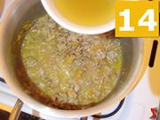 Quando avrete amalgamato bene la carne con l'olio, e questa avrą preso colore, dovrete aggiungere prima il vino a sfumare (13), e quindi il brodo (14), in modo che sfumi anch'esso e insaporisca le carni, oltre a renderle morbide. Infine spolverate con del pepe nero macinato (15) fresco e lasciate andare per altri cinque minuti.