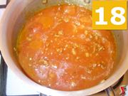 Una volta sfumato il brodo č il momento di unire la passata di pomodoro (16) e lasciarla cuocere dolcemente per lungo tempo (17), con il coperchio, fino a 90 minuti. Dopo circa 1 ora (18) salate quanto basta tenendo a mente che il parmigiano aggiungerą salinitą al piatto.