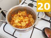 A circa 15 minuti dal termine della cottura del ragł mettete a bollire abbondante acqua salata per i tortellini, da cuocere poi dai 3 ai 5 minuti, e una volta lessati scolateli e saltateli (19) direttamente nel tegame con il ragł. Mescolate bene e delicatamente (20), mantecando con il parmigiano (21) e quindi servite in tavola ben caldo impiattando.