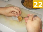 Ora riprendete le seppie che avevate sviscerato e lavato, mettetela sul tagliere e con un cucchiaio, prendete una porzione di condimento per metterla dentro alla seppia (22). Ripetete l'operazione fino a riempire completamente la seppia, e fate altrettanto con l'altra seppia. Quindi riprendete la padella, versateci dentro un filo d'olio (23) e fatelo scaldare con uno spicchio d'aglio. Quando l'aglio è dorato, aggiungete le seppie (24) nella padella, e fatele cuocere per circa mezzora, girando di tanto in tanto i molluschi per farli cuocere uniformemente. Durante la cottura, coprite con un coperchio, in modo che i vapori aiutino nella cottura con i vapori sprigionati. Fate attenzione alla punta della seppia, che in genere tende a sollevarsi e quindi a cuocersi meno, rispetto alla parte direttamente a contatto con la padella. Una volta pronto, spegnete il fuoco ed impiattate subito ben caldo, per servire in tavola accompagnando il piatto con un buon vino bianco fruttato.