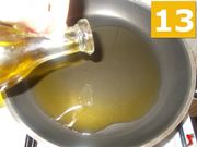 Prendete una padella ampia ed antiaderente, e versateci dentro cinque cucchiai di olio extravergine di oliva (13), per farli scaldare a fuoco medio. Sbucciate l'aglio, e quando l'olio è ben caldo, mettetelo a dorare nella padella (14), e poi aggiungete anche i piselli in scatola (15).