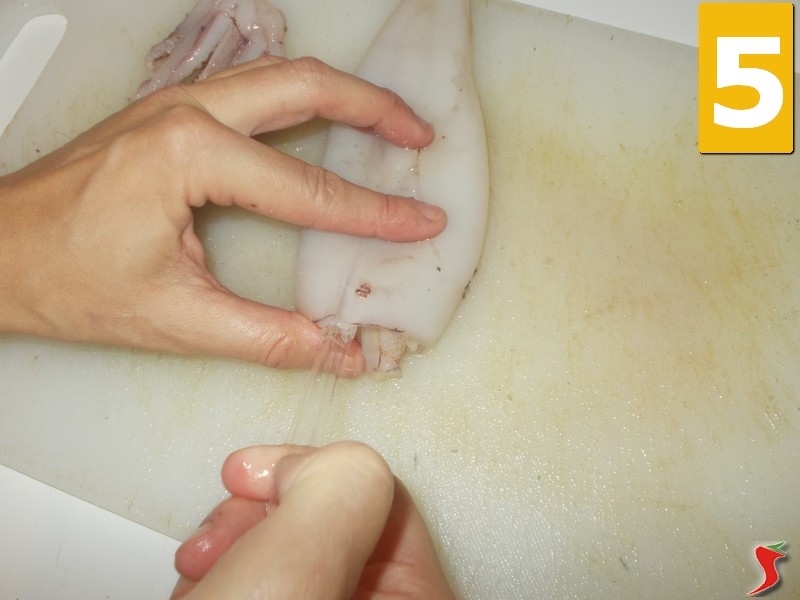 Lasciate sul tagliere la parte dei tentacoli, per eliminare, con un taglio netto, gli occhi della seppia (4), separandoli dai tentacoli. Quindi gettate via gli occhi. Quindi passate all'altra parte del corpo, quella più grande, dove si trova la lisca trasparente. La cartilagine va eliminata con le mani (5), semplicemente tirandola e sfilandola dal cappello. Si tratta di una lisca di cartilagine lunga e trasparente, infilata per la lunghezza, che serve a sorreggere il corpo. Senza alcun sforzo, prendetela con due dita e tiratela via dalla sua sede. Poi dovete estrarre tutte le viscere (6), che sono nel corpo. Dove era allocata la lisca, troverete una massa molle e giallognola, tirerete via con le mani, completamente, tenendo per la ricetta solo l'involucro esterno del corpo.