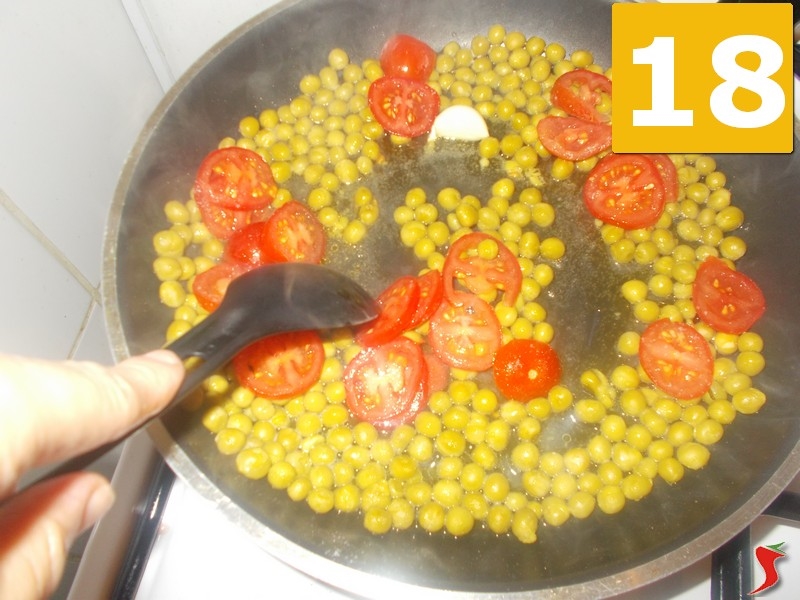 Una volta messi i piselli, aggiungete anche i pomodorini (16), salate il tutto (17), senza esagerare, perché la seppia è generalmente molto saporita, e quindi mescolate bene (18) con un cucchiaio di plastica. Infine, coprite con un coperchio e lasciate cuocere per circa un quarto d'ora, o più, finché i pomodorini non saranno appassiti.