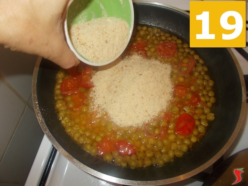 Quando i pomodorini si sono appassiti, aggiungete alla padella anche il pane grattato (19), che dovrete mescolare bene (20) con il condimento, in modo da amalgamare il tutto. Lasciate andare per altri 10 minuti, a fuoco moderato, e quindi spegnete il fuoco. Trasferite tutto in una ciotola (21), per far raffreddare un pochino, e proseguite la ricetta.