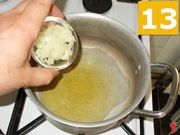 Quando l'olio è caldo, metteteci dentro la cipolla tritata (13) a soffriggere per un minuto, e poi anche i calamari (14). Girateli spesso (15) con il cucchiaio, per farli rosolare qualche minuto.
