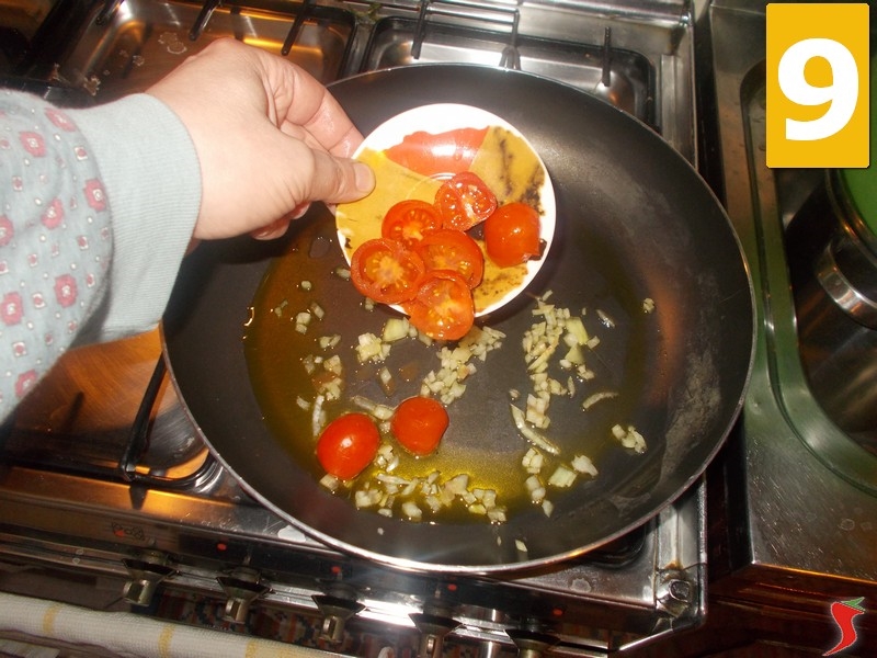 Ora ponete i pomodori pachino sopra il tagliere che avete utilizzato inizialmente (7) e con un coltello dalla lama seghettata divideteli in due parti (8). Quando avete terminato questo passaggio, unite i pomodori pachino nella padella con la cipolla (9) e mescolate accuratamente con un mestolo di legno.