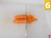 Poi passate agli ingredienti per il soffritto sbucciando e tritando finemente la cipolla (4). Quindi lavate bene la carota (5) che poi dovrete tagliare a dadini (6) da mettere a parte su un piattino.