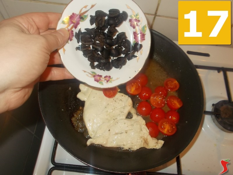 Ora spolverate i petti e i pomodorini con del pepe nero (16) macinato fresco, quindi mettete in padella anche le olive nere (17) tritate e infine spolverate con l'origano (18). Coprite la padella con il coperchio e continuate la cottura per altri dieci minuti mettendo la fiamma al minimo. Una volta pronto spegnete il fuoco, impiattate e servite immediatamente in tavola ben caldo.
