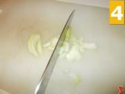 Ora mettete la cipolla sul tagliere e tritatela (4) finemente. Quindi metteteci anche le olive verdi e tagliatele in piccoli pezzi (5), quindi versate cinque cucchiai di olio di oliva extravergine (6) in un tegame ampio e fatelo scaldare.