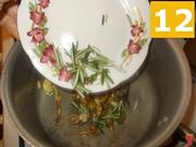 Nel frattempo sbucciate l'aglio e mettetelo nel soffritto (10). Quindi aggiungetevi anche il rametto di timo (11) e il rosmarino (12).
