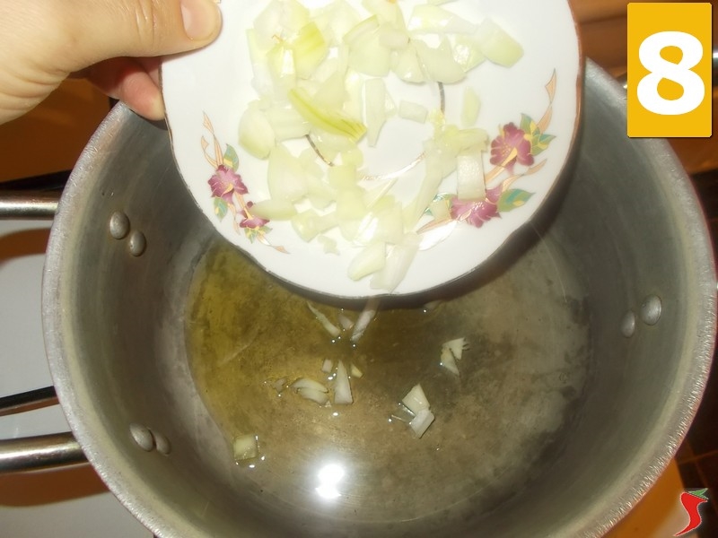 Nel frattempo che l'olio si scalda tagliate in pezzi il rametto di rosmarino (7), quindi unite all'olio extravergine la cipolla (8) e i pezzi di oliva (9) a soffriggere finché la cipolla non diviene trasparente.