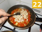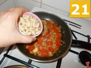 Quindi mescolate bene (19) il tonno con i pomodorini, e continuate la cottura per circa 20 minuti, a fuoco basso e coprendo con il coperchio (20). Fate attenzione che vi sia sempre un buon sughetto di fondo, e quando i pomodorini pachino si saranno ben appassiti, aggiungete anche i fagioli (21) che avevate messo da parte.