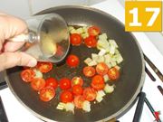 Ora salate (16) i pomodorini, e versate il vino bianco a sfumare (17) qualche minuto per poi aggiungere anche il tonno sgocciolato (18).