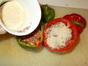 Una volta riempiti i peperoni versate sopra la carne un filo di olio. Quindi mescolate il parmigiano con il pan grattato e poi spolverateci i peperoni.