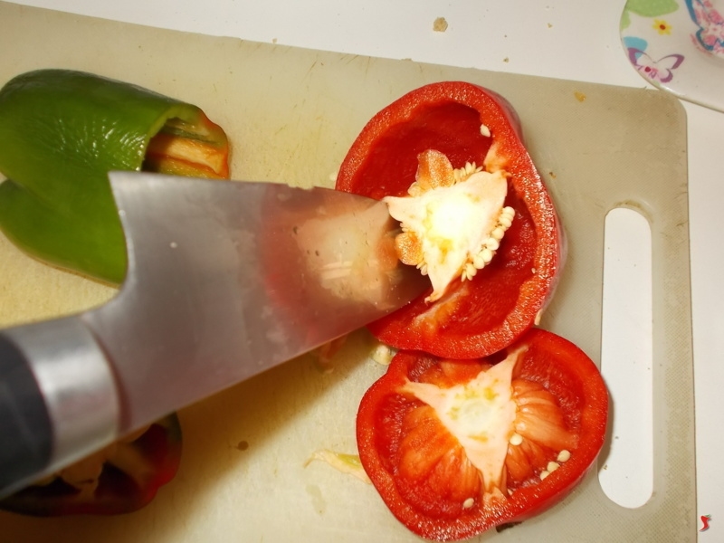Ora dedicatevi ai peperoni, che laverete bene e disporrete su un tagliere. Quindi tagliate via la parte superiore, il cappello, e iniziate a svuotarli dai semi e dalle parti bianche.