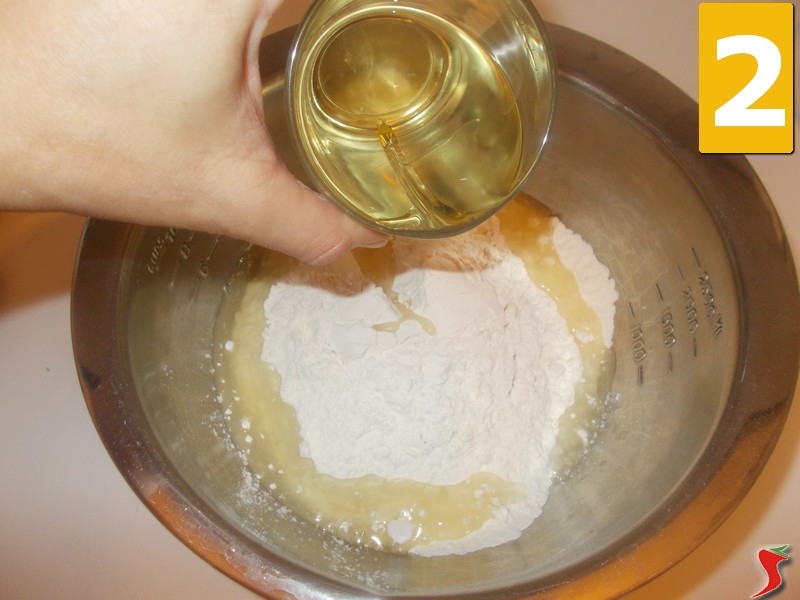 Aggiungete la farina dentro una planetaria di medie dimensioni oppure una terrina (1), dopo unitevi pian piano l'olio di semi (2) ed anche l'acqua (3).