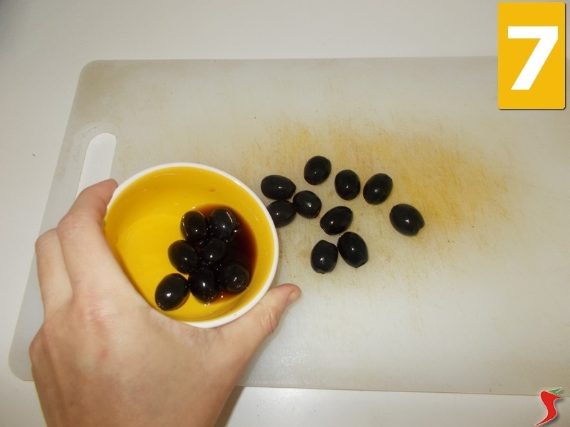 Ponete le olive nere sopra un tagliere pulito (7) e con un coltello dalla lama seghettata iniziate a dividerli a metà (8). Terminata questa operazione, lasciate da parte il composto in un piattino piano (9).