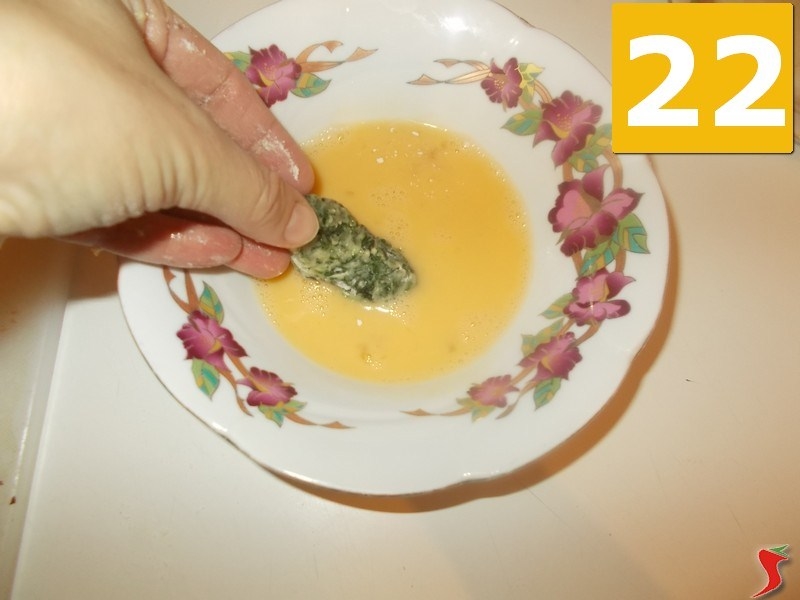 Ora prendete i sigari di spinaci e immergeteli nell'uovo (22) per poi rotolarli nel pan grattato (23) che avrete sparso su un piatto. Ripetete l'operazione per tutte le crocchette e mettetele su un piatto a parte (24).