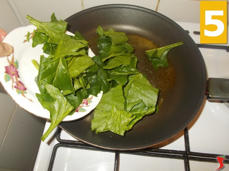 Ora fate sciogliere 20 g di burro (4) in una padella ampia ed antiaderente e una volta fuso unirvi gli spinaci (5) in cottura spolverando con del pepe nero macinato fresco e aggiustando di sale (6). Continuate la cottura per circa un quarto d'ora finché gli spinaci non saranno cotti.