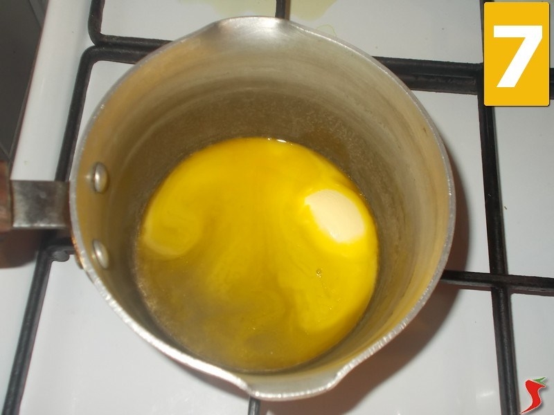 Mentre cuocete gli spinaci iniziate a preparare la besciamella sciogliendo il burro restante (7) in un pentolino. Una volta fuso unite la farina (8) setacciandola e iniziate a mescolare con un frusta fino ad ottenere il roux (9), un composto solido ed omogeneo.