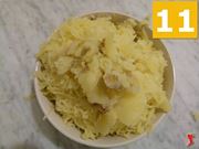 Al termine della cottura delle patate, dopo averle colate, inserire l’ortaggio all’interno di uno schiacciapatate (10) raccogliendo ciò che ne esce in un piatto (11). Procedere fin quando non avete terminato tutte le patate e lasciate raffreddare il composto.