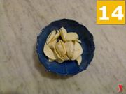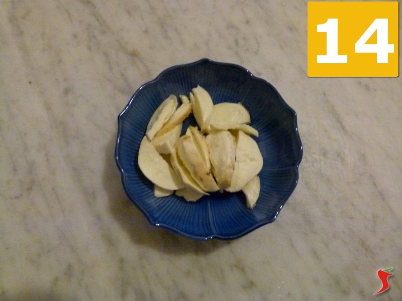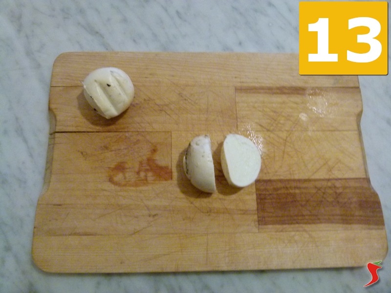 Mentre attendere che il composto di patate si freddi, si può passare alla provola (12), la quale va riposta su di un tagliere (13) per essere tagliata in piccoli pezzi fino a terminare tutta la quantità necessaria alla ricetta (14).