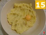 Ora è possibile iniziare la preparazione delle composto delle crocchette di patate. Quindi, aggiungere le uova (15), seguite poi dal pepe (16) e, infine, dal parmigiano grattugiato (17). Mescolare poi il tutto così da distribuire gli ingredienti in maniera omogenea.