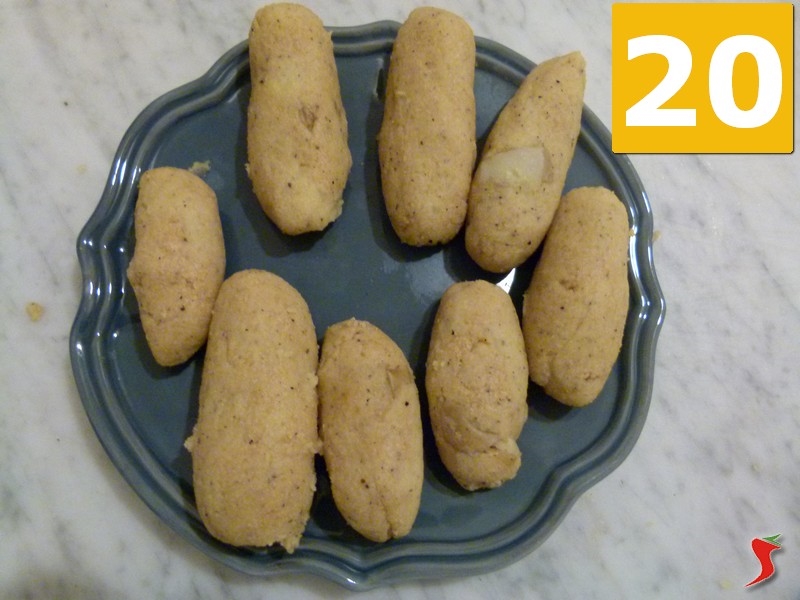 Ora che tutti gli ingredienti sono stati impastati con le uova, prendere una piccola parte per realizzare le crocchette e inserire al centro del composto una fettina di provola (18). Modellare l’impasto fino a conferire la forma dell’alimento desiderato (19). Procedere in questo modo fino al termine del composto di patate (20).