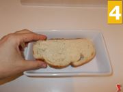 Ora in una pirofila rettangolare, disponete al suo interno la prima fetta di pane (4) , poi ricoprite la parte con la mollica della fetta di pane, con il tonno al naturale (5) e aggiungete un cucchiaio abbondante di olio extra vergine di oliva (6).