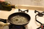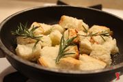 Per prima cosa prendiamo un tagliere di legno ed un coltello da pane ed iniziamo a tagliare il pane in tanti piccoli quadratini. In una pentola antiaderente mettiamo dell'olio e del burro ed iniziamo a scaldare a fuoco lento facendo sciogliere i due ingredienti. Non appena il burro si è sciolto iniziamo a mescolare per amalgamare per bene i due ingredienti.