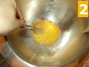 Iniziate la ricetta prendendo una planetaria dove rompere l'uovo (1) per poi sbatterlo bene (2) con la forchetta aggiustando di sale e spolverando con del pepe nero (3) macinato fresco.