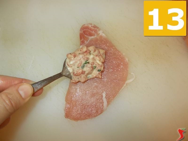 Quindi prendete un pochino di composto di macinato (13) con un cucchiaio e mettetelo al centro di una fetta di pancetta (14). Quindi iniziate ad arrotolare la fetta di pancetta (15) fino a chiuderla su se stessa.