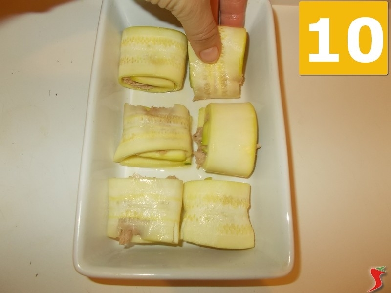Prendete parte del tonno con un cucchiaino e mettetelo sopra la zucchina (7), poi con la punta delle dita iniziate a rotolare la zucchina partendo dall'estremità in alto (8), per poi infine chiudere l'ortaggio (9) e lasciate da parte. Ripetete l'operazione in base alla quantità di zucchine che avete a vostra disposizione.