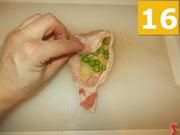 Adesso potete iniziare ad avvolgere la carne su se stessa a partire da un lato (16) fino ad arrotolarla tutta (17) e fermarla con uno stuzzicadenti (18). Ripetete l'operazione per tutte le fettine, mettendo a parte gli involtini.