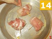 Infine aggiustate di sale (10) la carne e quindi iniziate ad avvolgere il tutto (11) a partire da un lato fino ad arrotolarlo tutto su se stesso e fermare l'involtino con uno stuzzicadenti (12), in modo che non si apra durante la cottura in forno.