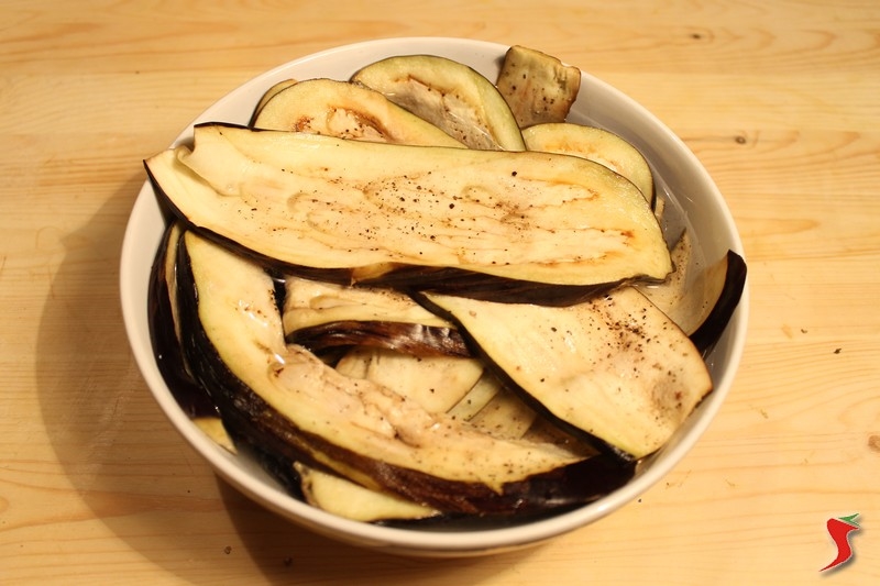 Ora salate abbondantemente le melanzane e pepatele. Lasciandole distese su un telo fatele sgocciolare per mezza giornata possibilmente adagiando un asse con un peso sopra di esse, per facilitare la sgocciolatura dell'acqua. Lasciatele asciugare per una notte o comunque per almeno 10-12 ore.